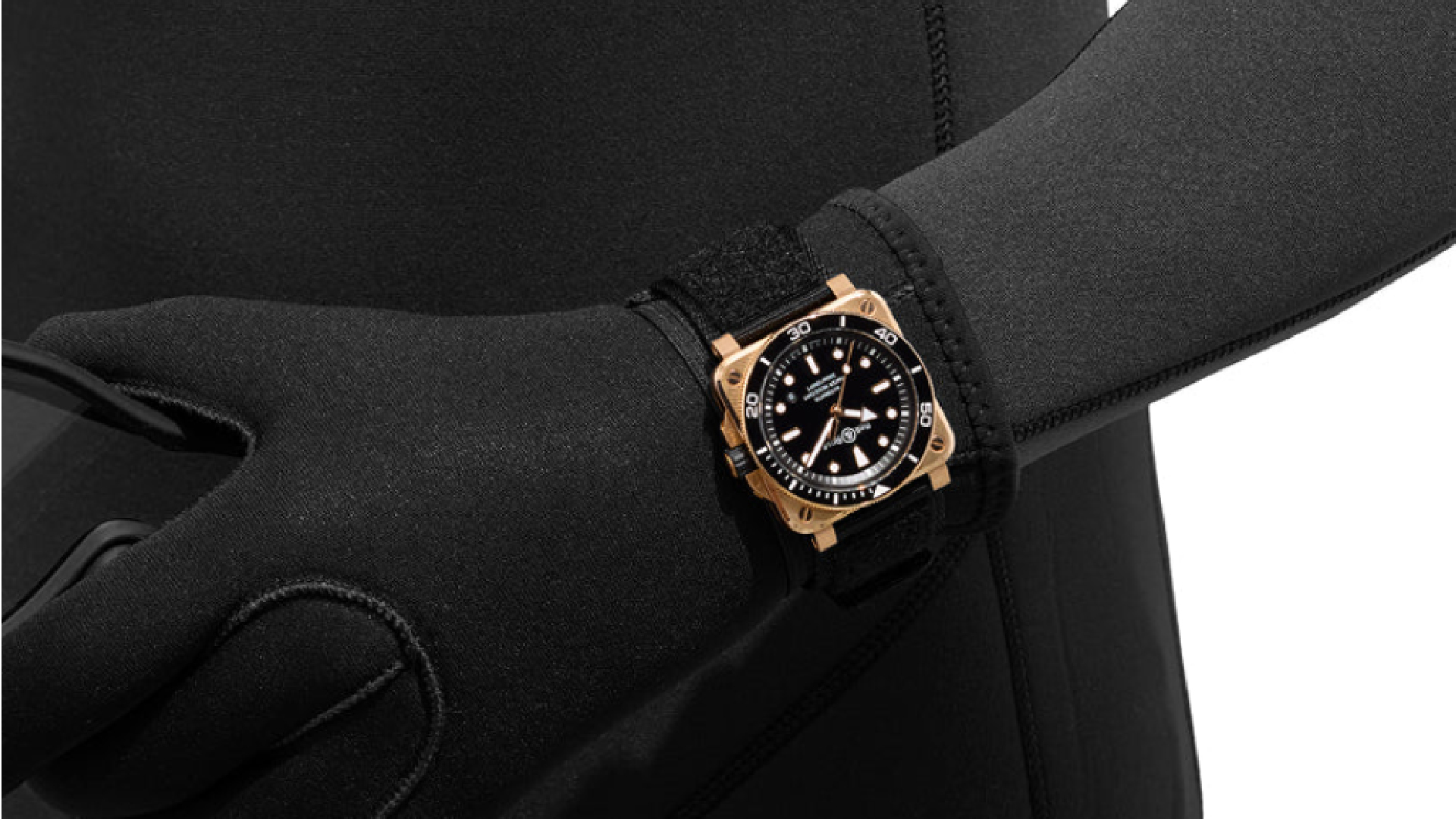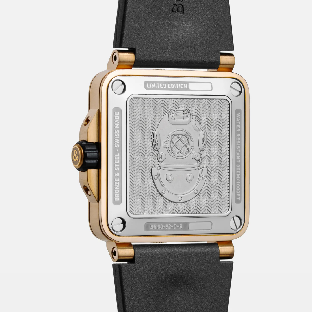 Built on the lines of the updated BR-03 Diver introduced in 2024, its square case measures 42 mm with a thickness of 12.3 mm. The case is crafted from marine-grade CuSn8 bronze, an alloy composed of 92% copper and 8% tin, renowned for its durability and the natural patina it develops over time. It is further refined with satin-brushed surfaces and polished accents. Complementing it is the unidirectional rotating bezel, also in bronze, fitted with a polished black ceramic insert engraved with a graduated 60-minute scale filled with Super-LumiNova X1 to ensure legibility underwater. Other dive watch features include a screw-down crown with protective guards and a solid steel screw-down caseback, ensuring water resistance of up to 300 metres – tested to meet ISO 6425 standards for dive watches.
