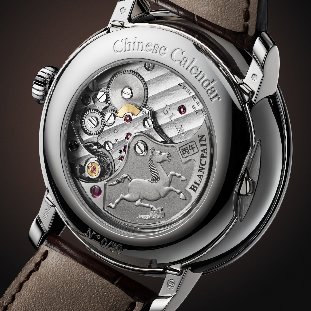 Powering the watch is Blancpain’s automatic calibre 3638, a movement developed over five years and comprising 464 components. The movement is driven by three barrels that deliver a seven-day power reserve. It operates at a frequency of 4 Hz and incorporates a silicon balance spring for improved chronometric stability. The movement is fitted with an 18K white gold rotor, frosted and engraved with a galloping horse and a flying swallow, flanked by a natural ruby and the Chinese characters for “horse” and “fire.”