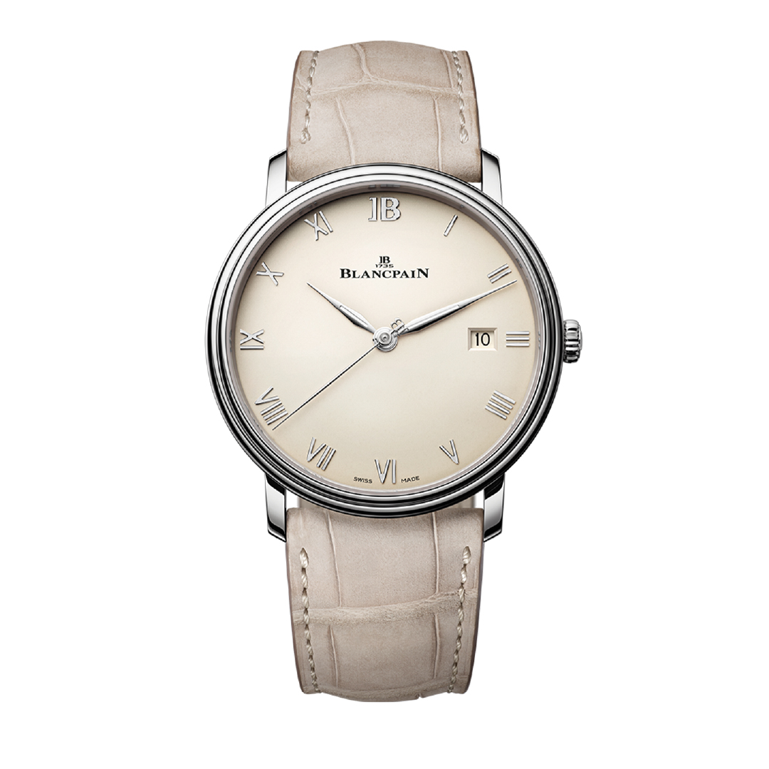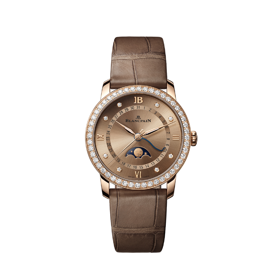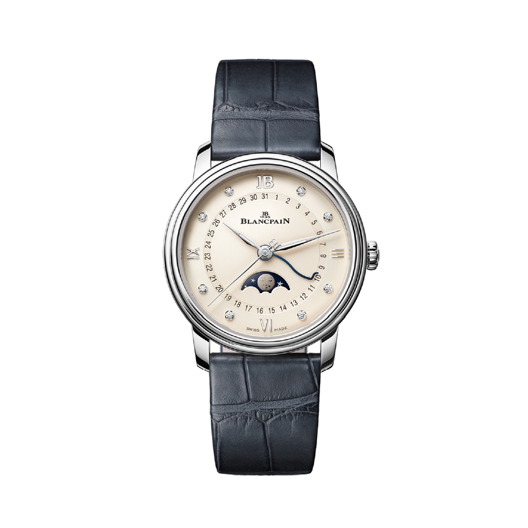Across the collection, Roman numeral indexes in solid gold feature satin-brushed surfaces with polished bevels, while slender hands now have luminescent inserts for improved legibility. The traditional “12” numeral is replaced by Blancpain’s historical “JB” signature, referring to its founder, Jehan-Jacques Blancpain. The two moonphase models feature enlarged apertures with a ceramic disc and a domed, satin-finished gold moon, along with a date complication framing the central dial, indicated by a wavy blue hand.