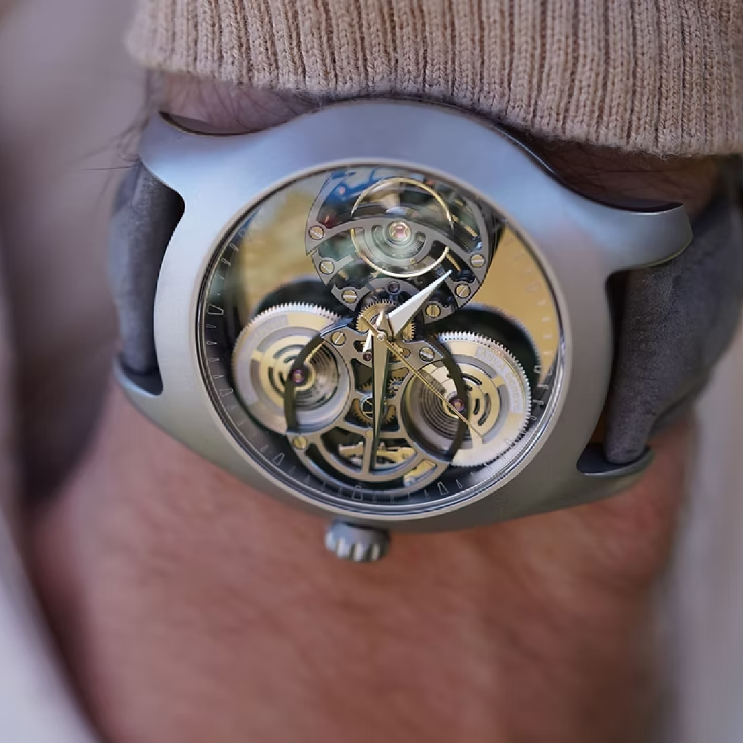 The collection was born in 2021 when founder Arpa took his two kids to work with him, and at that moment the other collections felt too linked to himself. He wanted something new this time - something more artistic - and so the new collection began from scratch. “So we really designed everything for the movement, which always has two barrels for very strong reliability and stability. It goes to four hertz. Even the tourbillon is four hertz,” says Arpa. “And the design, I wanted it to be like a sculpture in space. I’ll take all the space that is available inside the watch, not flat, but really like architecture.” For him, the star of the product is the movement, fully in-house, shining in glory inside the newly designed wavy-shaped case, which was designed by his son, Jérémie Arpa, crafted in materials like titanium and extending to more complex ones like moissanite and sapphire - also seen in ArtyA’s latest two timepieces developed for Dubai Watch Week 2025 in collaboration with Ahmed Seddiqi, celebrating the United Arab Emirates.