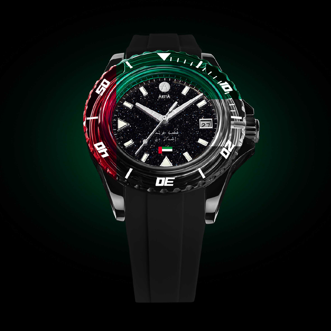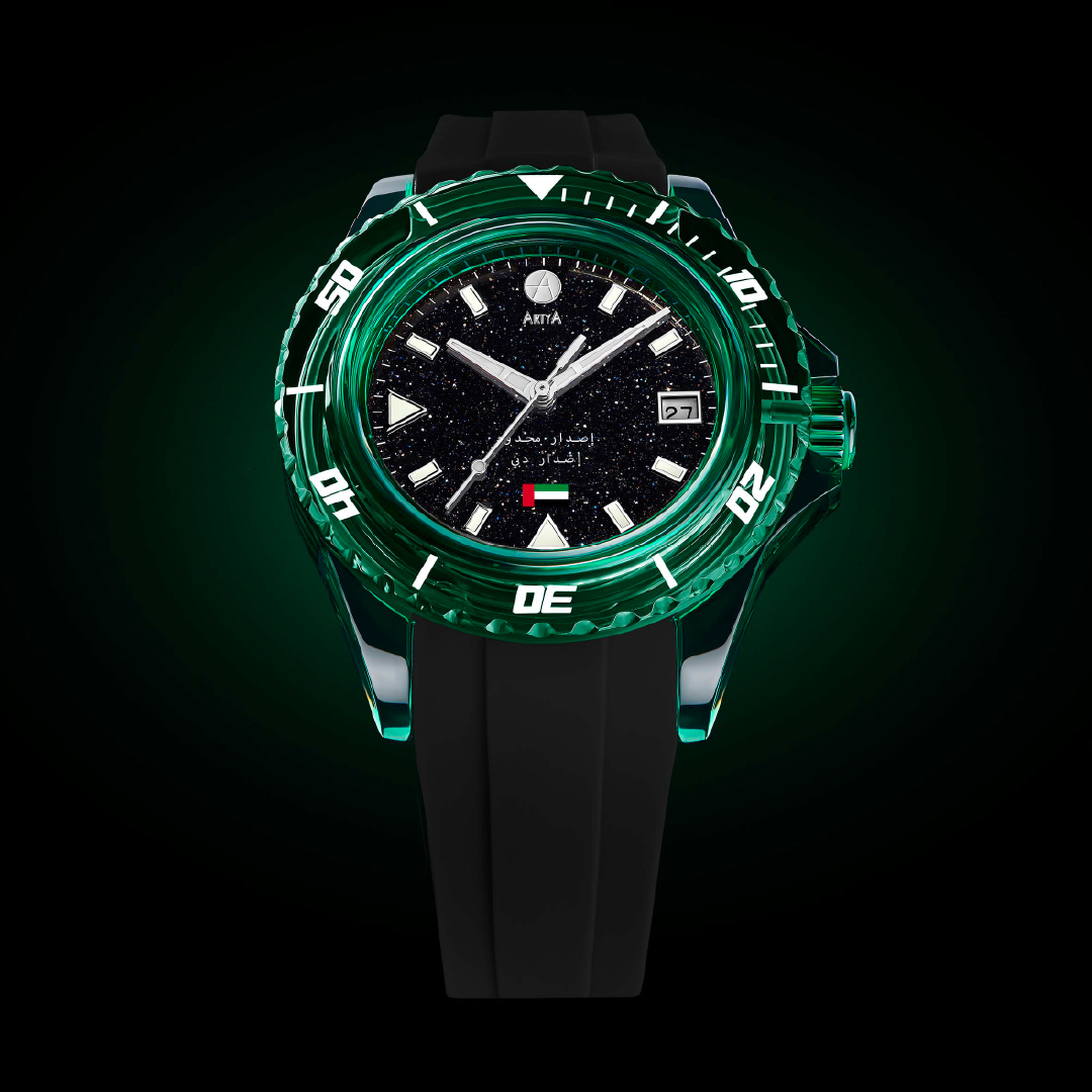One is a 10-piece limited edition crafted entirely from emerald-green sapphire, while the other is a unique one-of-a-kind model featuring a four-colour NanoSapphire bezel replicating the UAE flag. Both watches follow the signature AquaSaphir design, built around a 41 mm case made almost entirely of sapphire crystal - including the bezel, case middle, crown, and both crystals. The dials are shimmering aventurine, and the movement is the La Joux-Perret G100, beating at 4 Hz with a 68-hour power reserve.