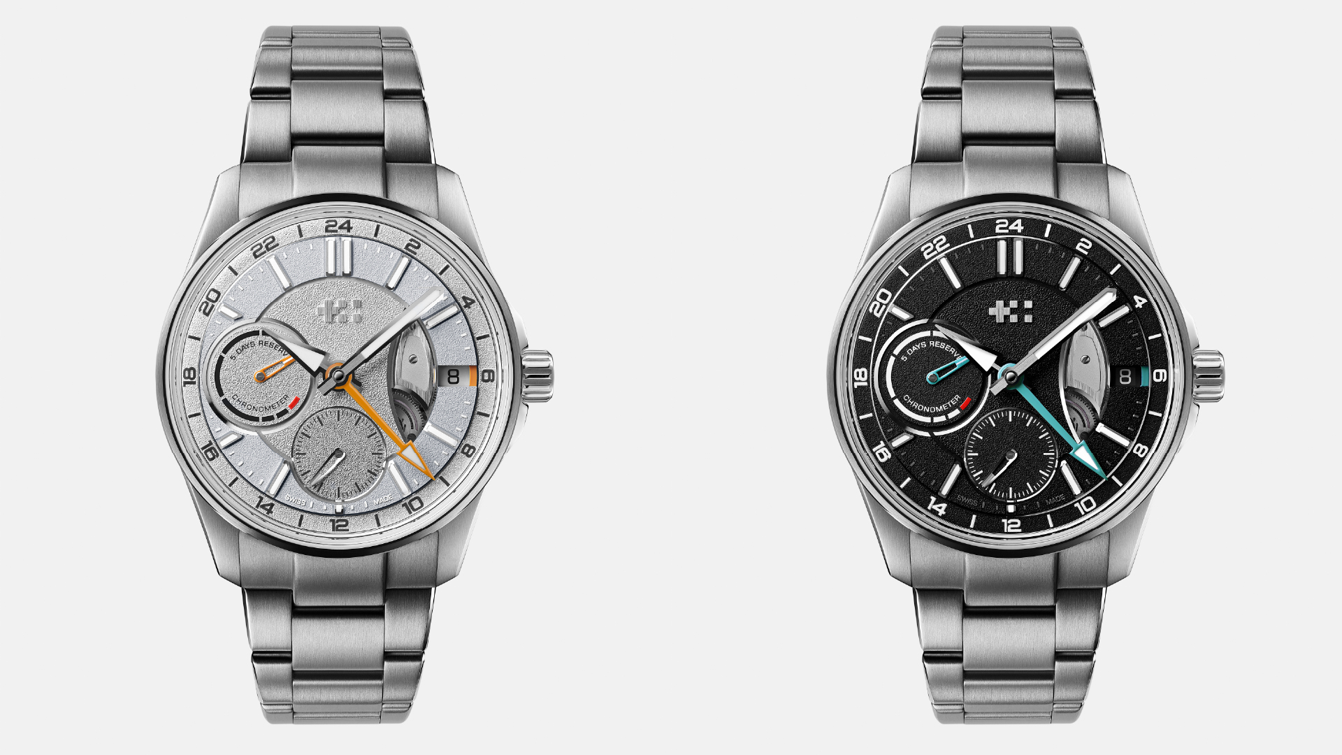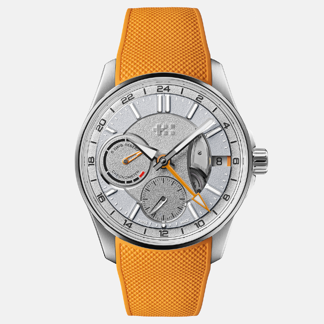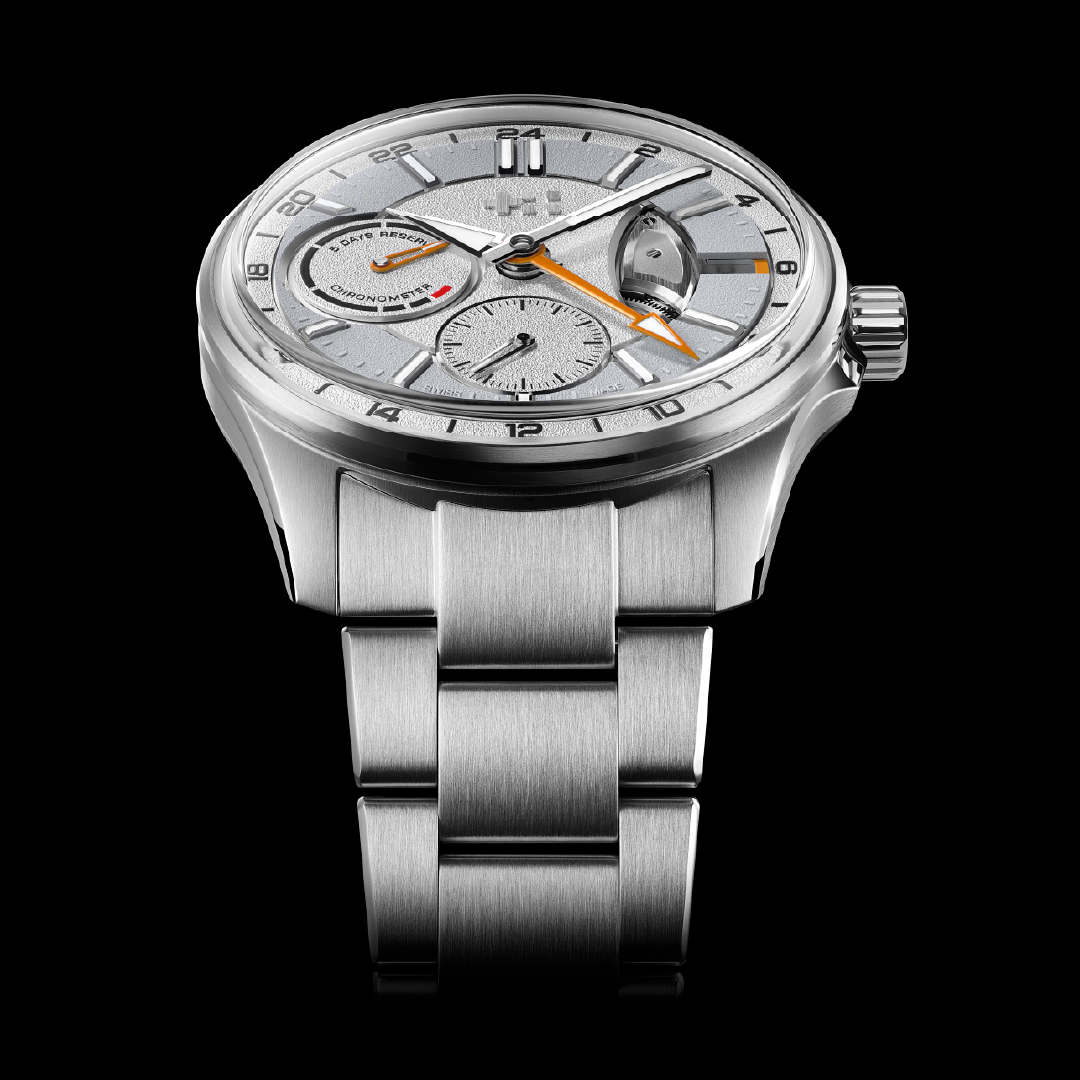 At the periphery lies the 24-hour ring, which carries the applied hour indices framed by a diamond-polished rhodium border. The markers are linearly brushed with polished facets and filled with Super-LumiNova Grade X1 BL C1 for improved visibility in low light. The hour and minute hands feature linear brushing with diamond-polished chamfers, while the small seconds hand is diamond-polished. The GMT hand and power-reserve indicator are highlighted in either orange or blue lacquer, depending on the dial variant, both of which are also filled with Super-LumiNova.