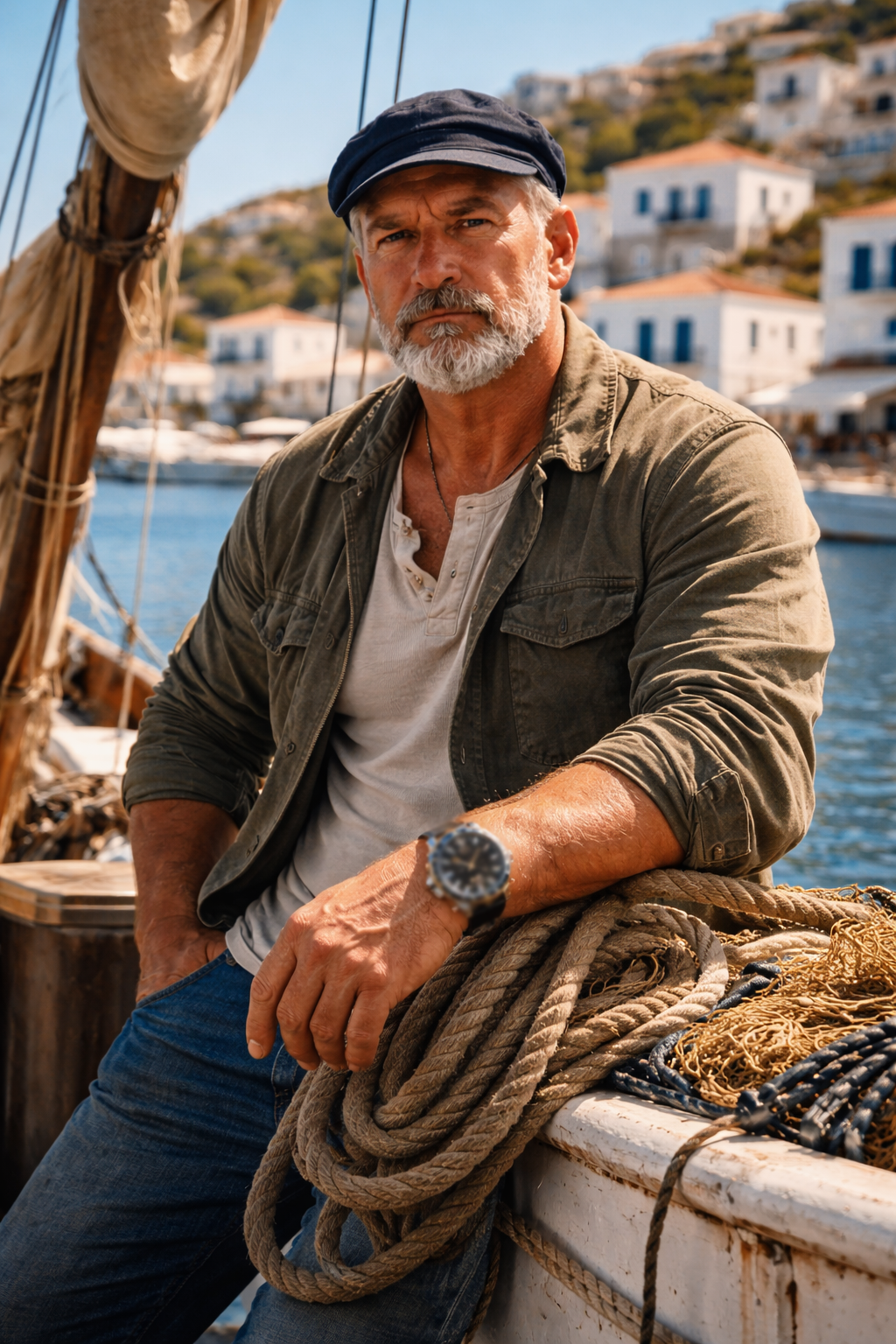 He’s wearing fatigues that have faded to a nameless grey, and he carries the faint, permanent scent of engine grease and salt.