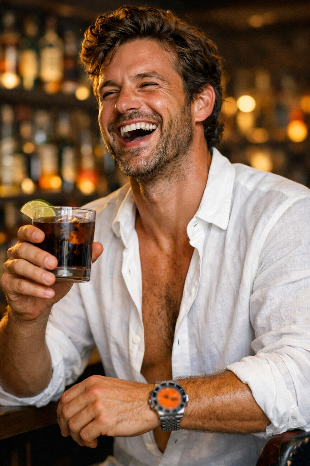 He orders a drink before sitting down, and by the time you look up properly, he’s already laughing with someone he’s just met.