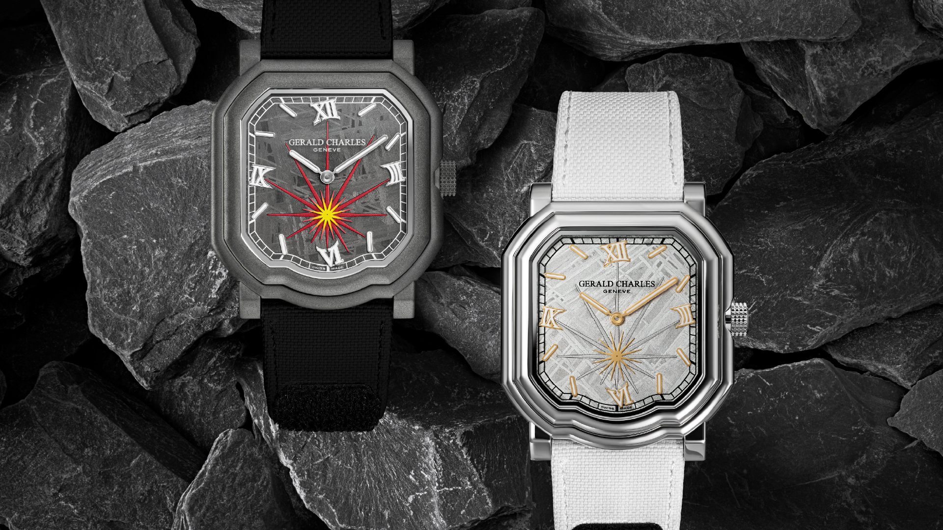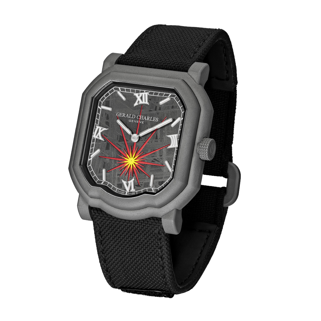 The timepieces follow two thematic interpretations. The Black model represents the ‘moment of impact’, featuring dark meteorite over a red anodised aluminium baseplate. Radial apertures allow flashes of red to show through, complemented by a fiery gradient on the small seconds sub-dial. The Silver model represents ‘cooling and stillness’, with silver meteorite and an opaline, rhodium-treated baseplate with gold accents. Both versions feature ‘deformed’ Roman numerals and baton indexes that appear tilted, simulating the shockwaves of a cosmic collision. For visibility, the hands and markers are treated with white Super-LumiNova X1.