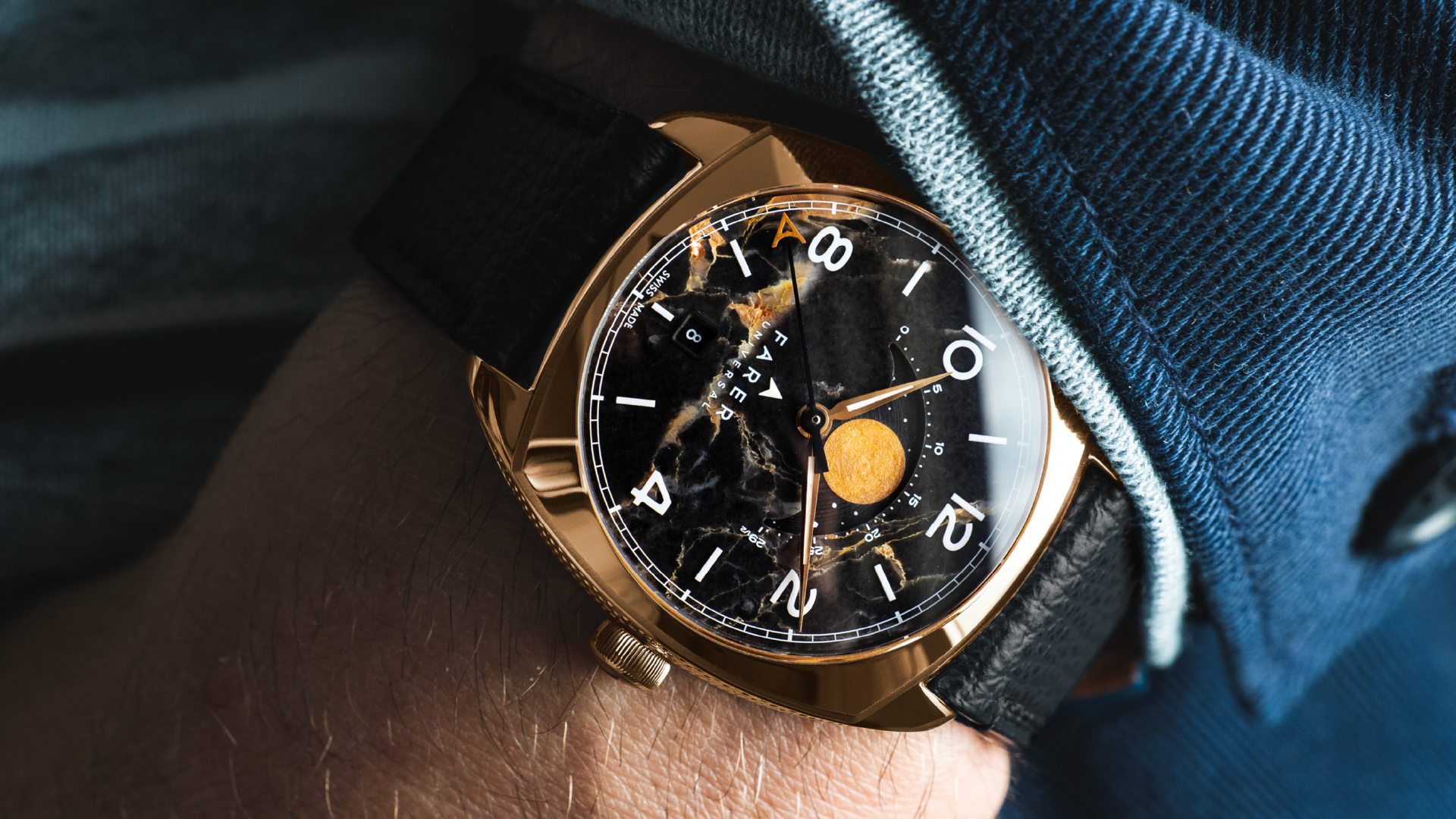 The dark blue aventurine dial, also known as goldfluss, is flecked with copper inclusions, creating a shimmering, starry effect. Against this celestial backdrop, the moon-phase display features a moon crafted from white mother-of-pearl on an aventurine disc. The characteristic Saxon asymmetry takes centre stage—hours, minutes, and small seconds are arranged to the left, while the Panorama Date sits to the right. Solid-gold applied indices, paired with white-gold hands coated in Super-LumiNova for nighttime legibility, combine elegance with functionality.