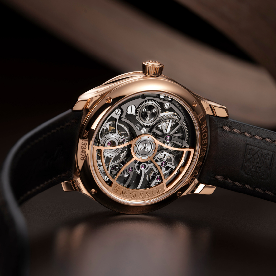 The 40 mm timepiece is built around symmetry and light, and measures 10.7 mm in height. It features the asymmetric case middle characteristic of the Endeavour line. The entirely skeletonised dial allows the movement to be viewed without obstruction, where the bridges and main plate are treated in an anthracite finish and decorated with drawn strokes, while the appliqué indices and leaf-shaped hour and minute hands in 5N red gold balance it with subtle warmth. The crown, also in 5N red gold, is engraved with the Moser “M”.
