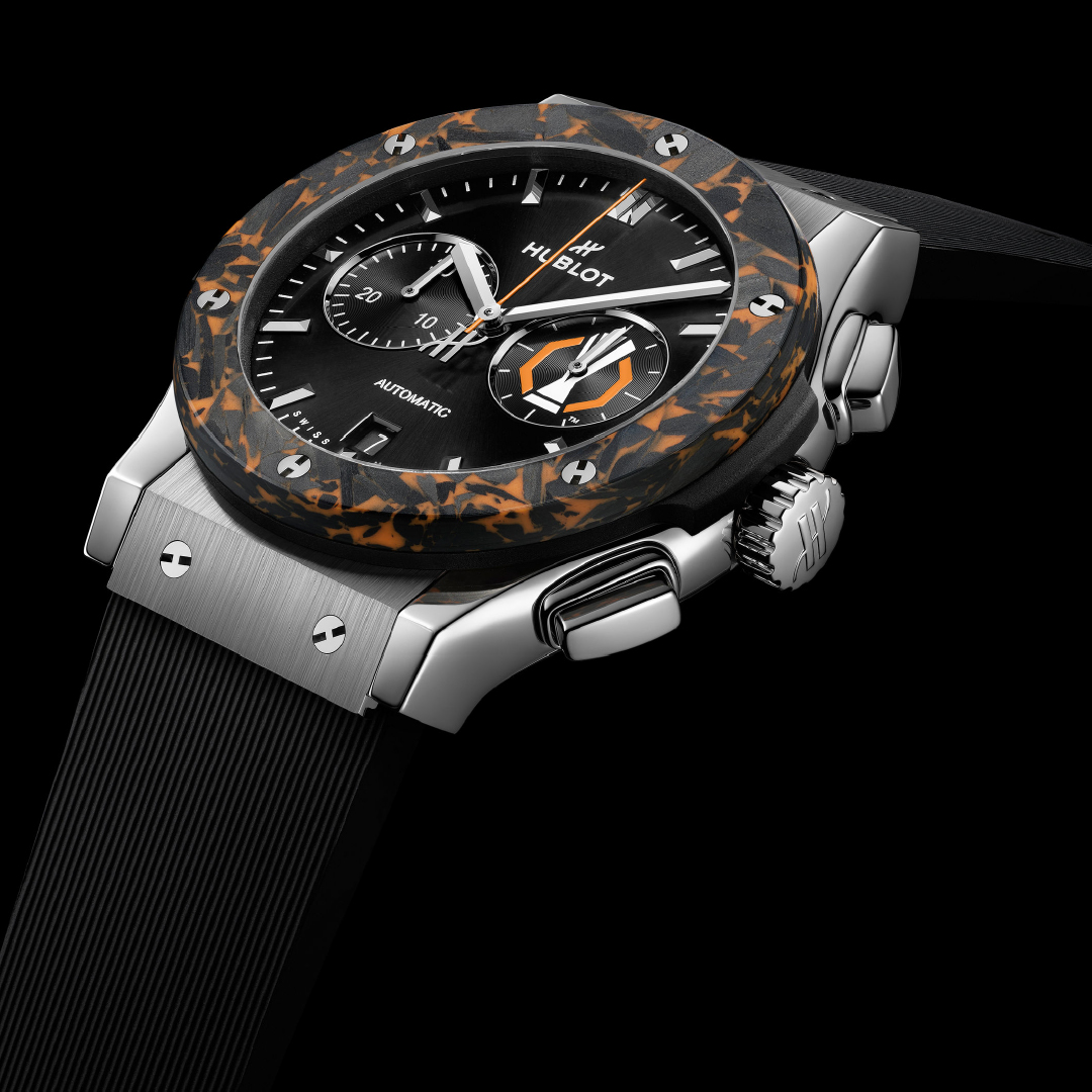 Hublot presents the Classic Fusion Chronograph UEFA Europa League Titanium Carbon, featuring a case that combines titanium and carbon. The watch houses a chronograph movement and reflects the brand’s continued association with European football.