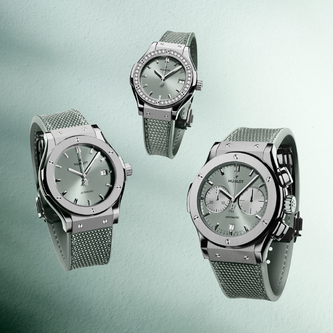 The 33 mm Classic Fusion Titanium Sage Green Diamonds features a titanium bezel set with 36 diamonds and is powered by the HUB2912 quartz movement. The 42 mm Classic Fusion Titanium Sage Green offers a minimalist, unisex aesthetic with three hands, a date at 3 o’clock, and the HUB1110 automatic movement, operating at 4 Hz with a 48-hour power reserve. Completing the range, the 45 mm Classic Fusion Chronograph Titanium Sage Green marks Hublot’s first sage green chronograph, combining a satin-finished titanium case with silver-toned counters, a date at 6 o’clock, and powered by the HUB1143 automatic calibre with a 48-hour power reserve.