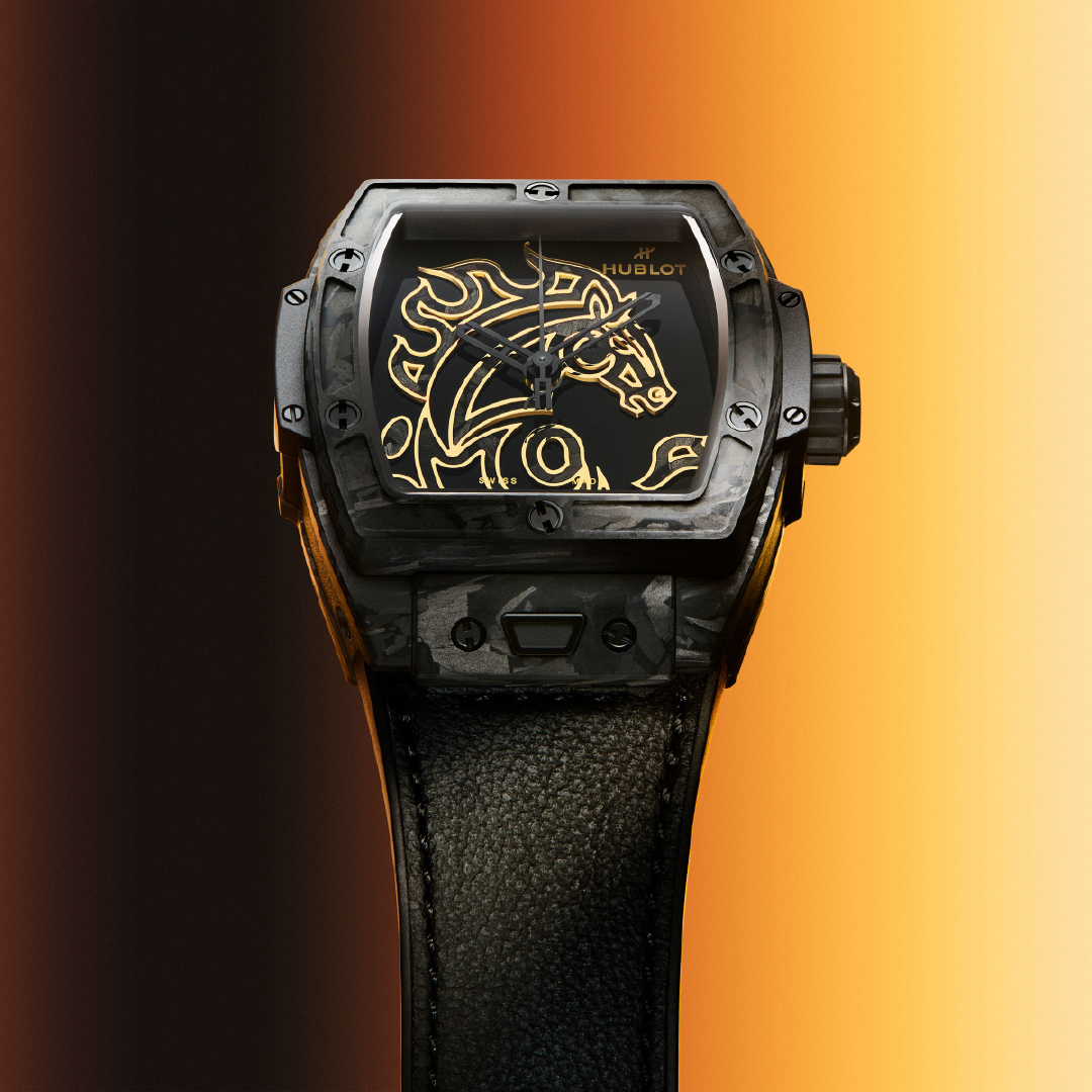Hublot marks the Year of the Horse with the Spirit of Big Bang Frosted Carbon, a limited edition of 88 pieces. The 42 mm tonneau-shaped case is crafted entirely from matte frosted carbon and paired with a sapphire crystal featuring anti-reflective treatment, a smoked sapphire caseback, and 100-metre water resistance.