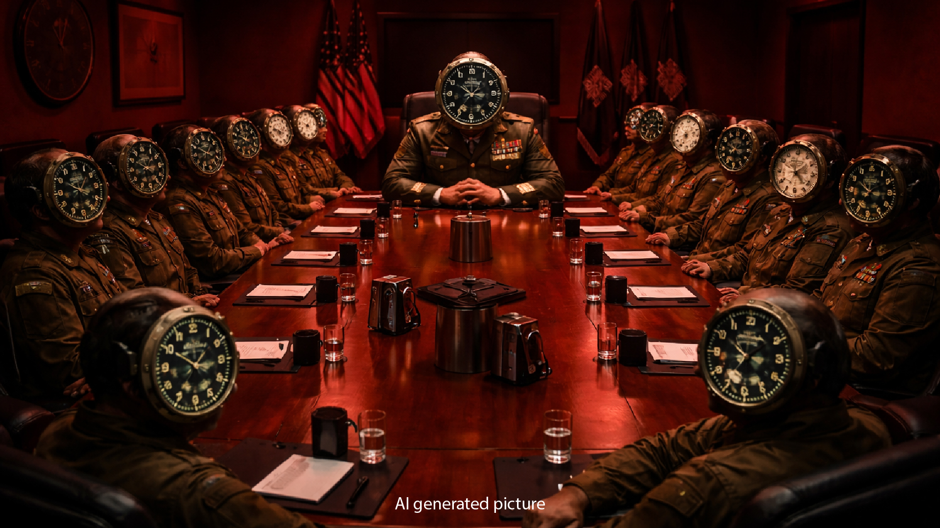 Chairs are occupied without negotiation. A map has been straightened. Very slightly, but with conviction. Someone has chosen the seat with the clearest line of sight to the door, and someone else has already noticed that choice and filed it away for later. There is no small talk. Just the faint, habitual choreography of readiness. Sleeves adjusted. Notes aligned. A glance down at the wrist, not to check the time, but to confirm it has not slipped.