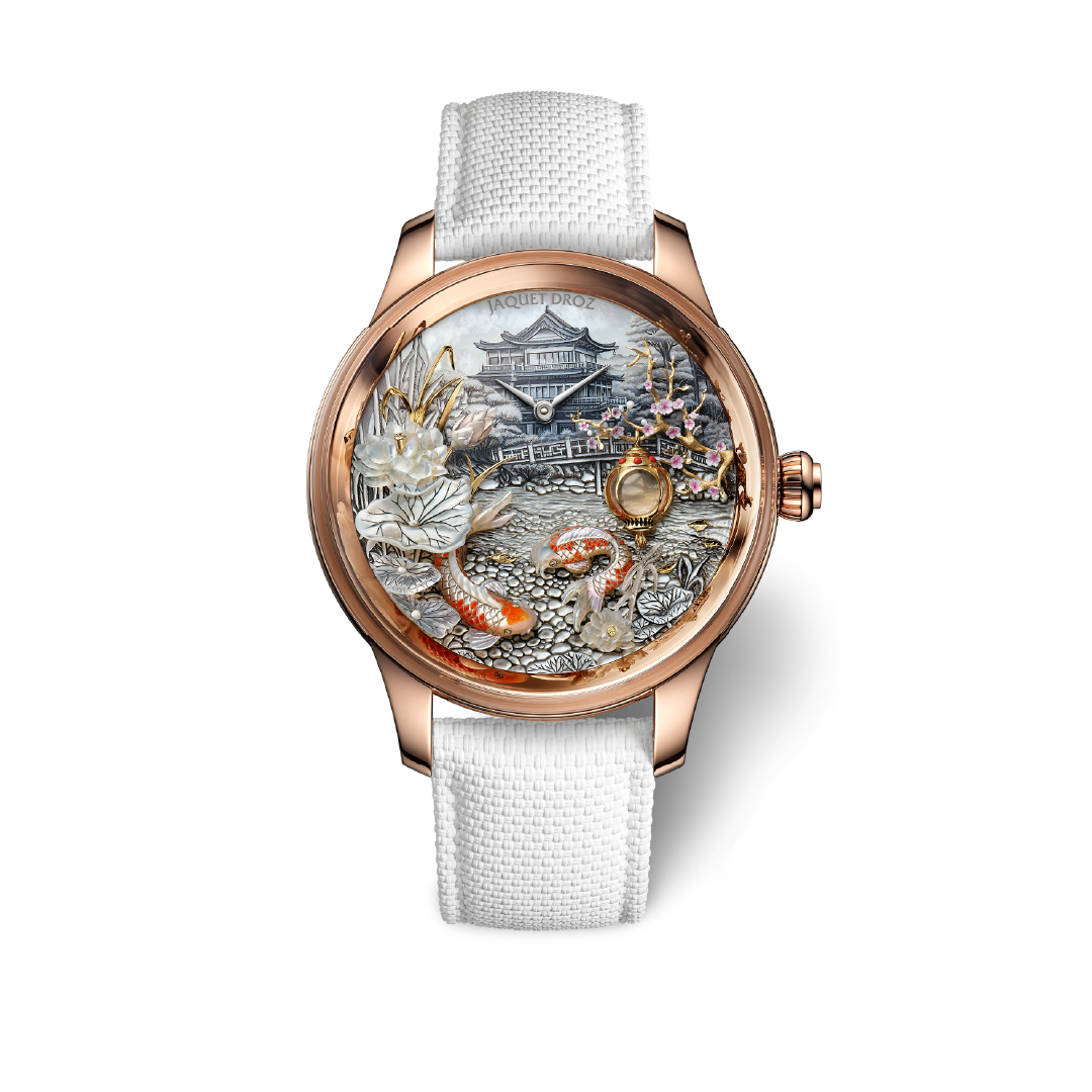 Jaquet Droz has unveiled the Petite Heure Minute Red Gold “Japanese Garden,” a unique timepiece (Ref. J0050230051) developed in collaboration with a private collector. The creation marks a shift for the maison toward highly personalised métiers d’art watches, using a 41.1 mm 18K red gold case as a stage for a three-dimensional landscape inspired by a traditional Japanese garden. Unlike conventional luxury dials that employ mother-of-pearl as an overlay, this dial is sculpted entirely from a single plate of ultra-white Pacific mother-of-pearl, which serves as the structural foundation for the entire scene.