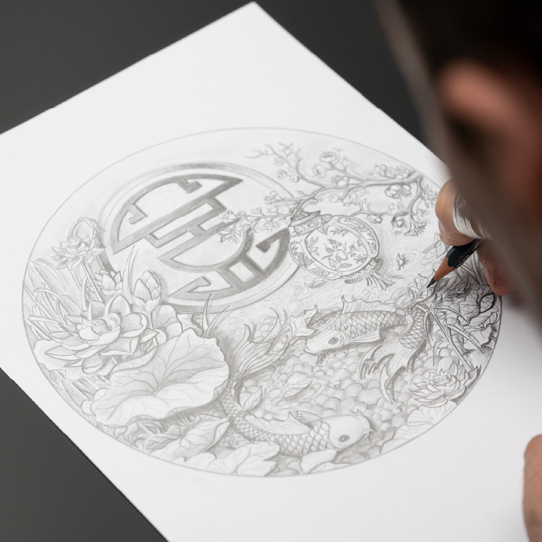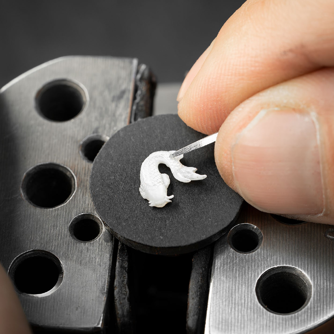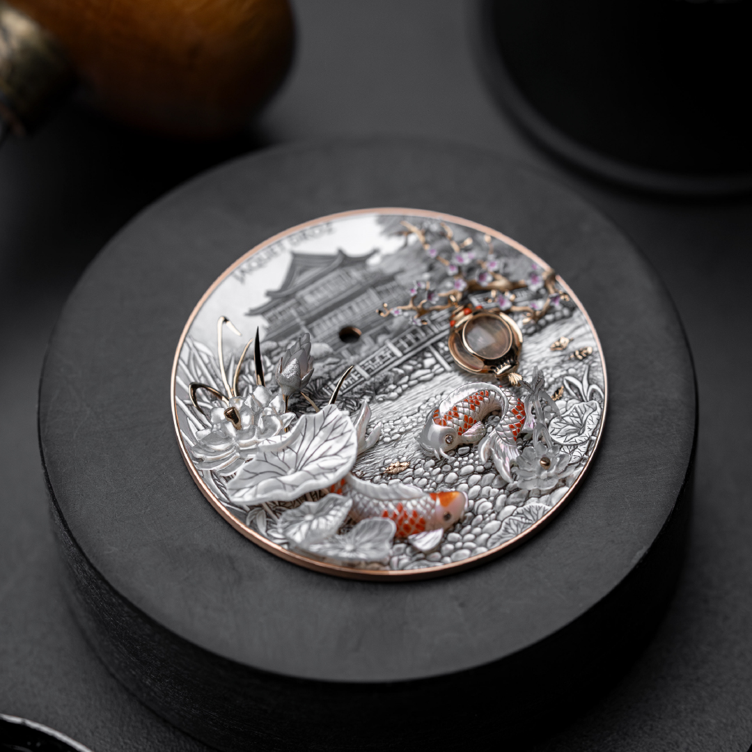The composition features 25 individual appliqués that recreate the serenity of Japanese scenery. The scene includes a hand-carved temple, a blossoming cherry tree, a stone lantern, and water lilies, all rendered through a combination of mother-of-pearl carving and 18K yellow gold craftsmanship. Technical complexity is concealed within the finest details; for example, the reed stems measure just 0.1 mm in thickness, while the eyes of the koi carp are set with 0.5 mm diamonds. Enhancing the sense of realism, a polished mother-of-pearl cabochon at the centre reflects the surrounding elements, simulating the play of light on water.