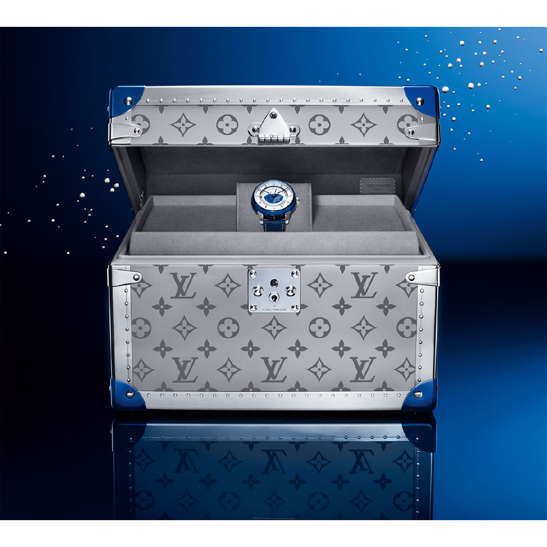 Under the domed sapphire crystal, the dial showcases a celestial aesthetic, with a blued titanium central disc decorated with a starry sky motif of white-gold pins and gold leaf. The Louis Vuitton initials are subtly integrated into the constellation pattern. Surrounding this disc are concentric jumping date and a 24-hour GMT indicator. A spherical day-night indicator in 5N rose gold and flame-blued steel completes two rotations every 24 hours. Louis Vuitton’s design identity is further reinforced by diamond-cut blue PVD hands and Tambour-style numerals. On the caseback, “Louis cruises with Denis” has been inscribed to mark the collaboration.