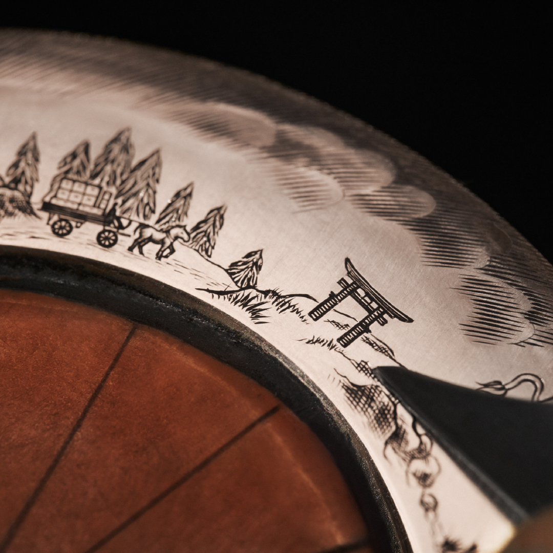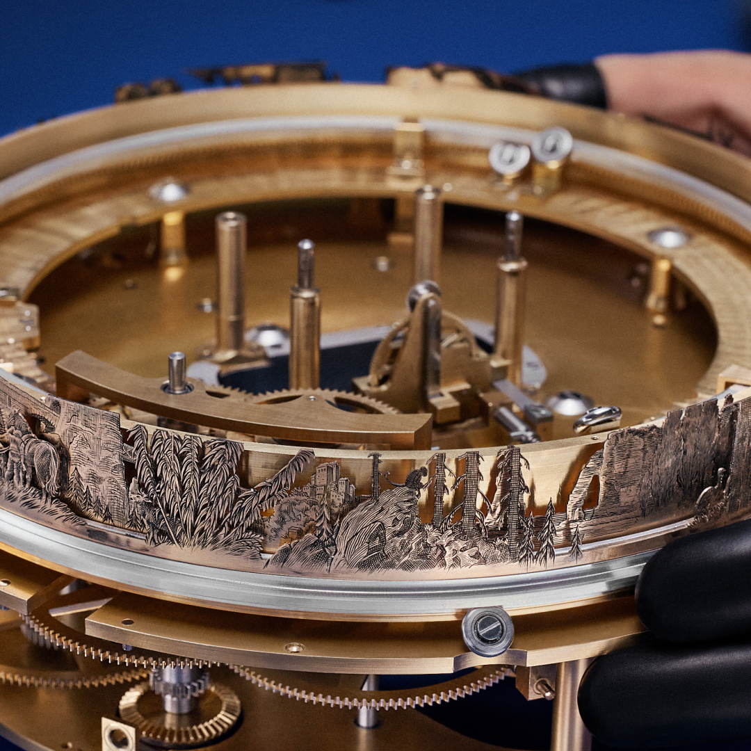 The clock is mounted on a titanium base decorated with flame-blued meteorite marquetry and secured in an adjustable cradle inspired by marine chronometers. In its reference position, it measures 310 mm in width, 266 mm in depth, and 260 mm in height, extending to approximately 310 mm when inclined, with a total weight of around 10 kg. A rose-gold engraved dome on the upper tier conceals the docking interface and features the constellation of Hercules, a reference to the astrological sign of Louis Vuitton’s founder. Decorative rotating gold-engraved discs by master engraver Michèle Rothen and illustrated panoramas by Belgian artist François Schuiten complete the clock.