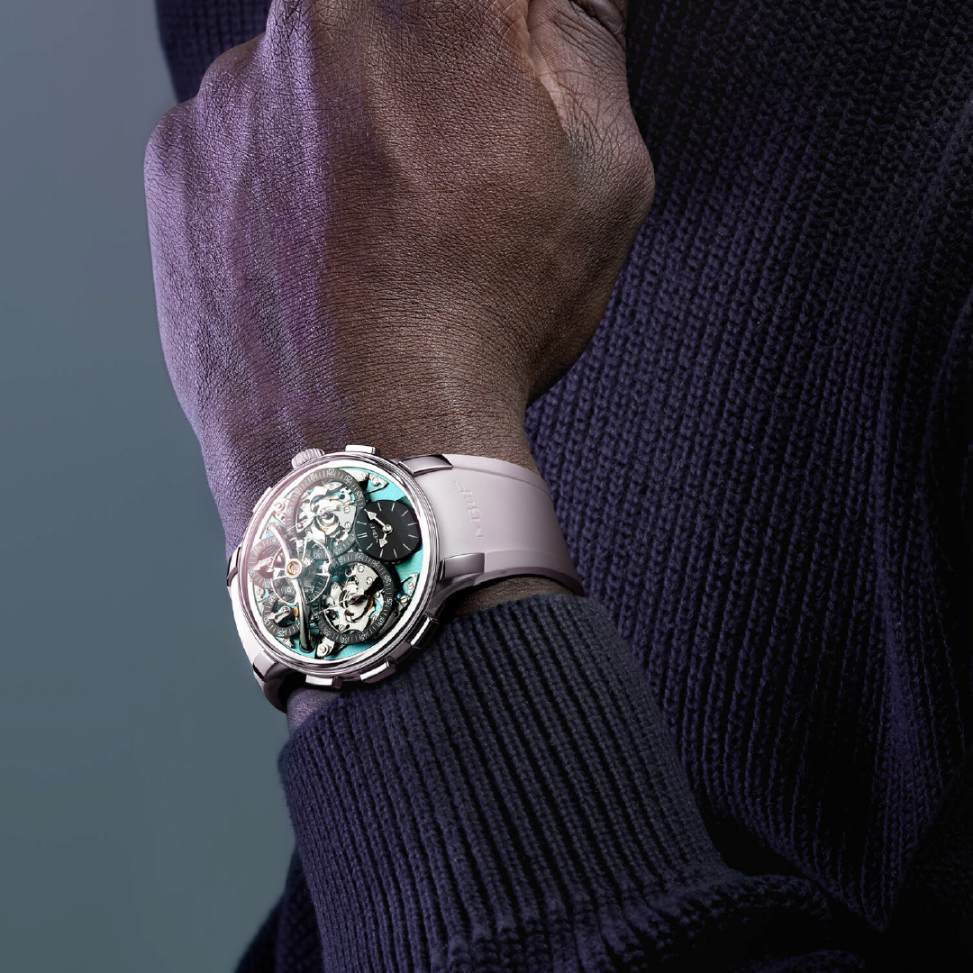 The timepiece is now offered in MB&F’s robust EVO architecture. The 44 mm case is crafted from grade 5 titanium, combining brushed, sandblasted, and polished surfaces, and measures 18.2 mm in height. Lightweight yet resilient, it incorporates MB&F’s proprietary FlexRing shock absorber positioned between the case and the movement to protect the delicate mechanism from shocks. A screw-down crown improves water resistance to 80 metres. The five pushers control the watch’s functionality, with four dedicated to the twin flyback chronograph mechanisms and the signature Twinverter pusher at 9 o’clock. With a single press of this “magic button,” as McDonnell calls it, the wearer can simultaneously start, stop, or swap the running states of both chronographs.