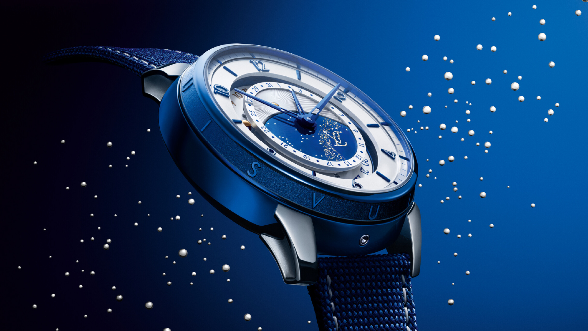 The aquamarine dial plate provides a vivid backdrop for the two chronographs’ displays. The 60-second counters lie at 9 and 3 o’clock, and the 30-minute counters at 11 and 1 o’clock, all indicated by Super-LumiNova-treated hands. Floating above them is the oversized flying balance wheel at 12 o’clock. For this EVO edition, the hours and minutes display is placed on a black sub-dial at 6 o’clock that is subtly tilted towards the wearer, thereby improving legibility.
