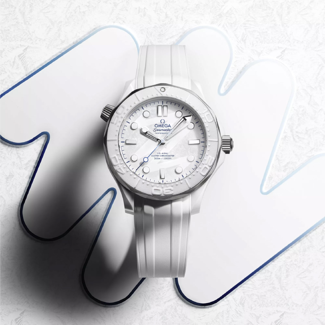 On the reverse side, the grade 5 titanium caseback is stamped with the Milano Cortina 2026 emblem, permanently anchoring the watch to the XXV Olympic Winter Games. The Omega Seamaster Diver 300M Milano Cortina 2026 is paired with an integrated white rubber strap and a grade 5 titanium buckle for a secure and comfortable fit.