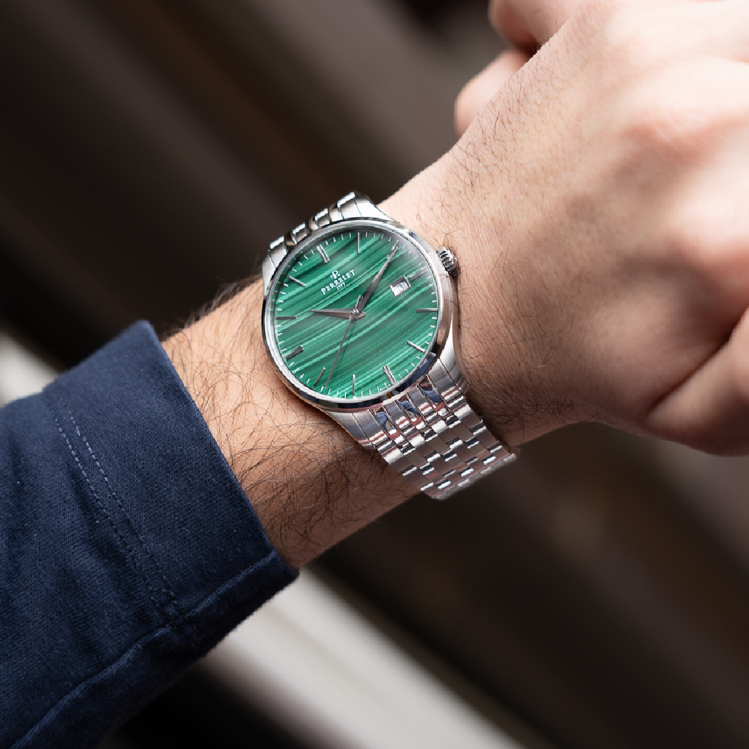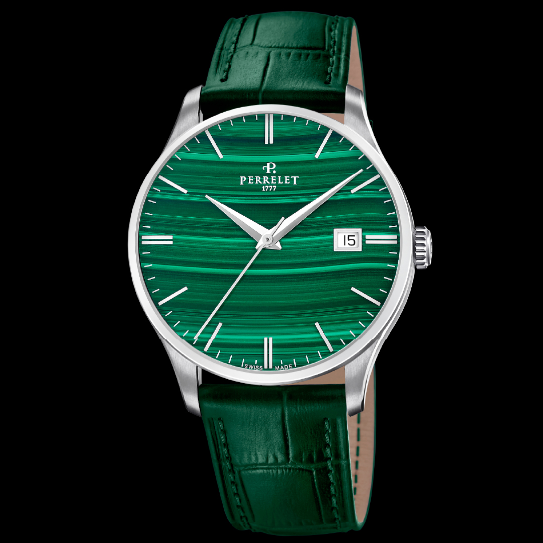 Perrelet has expanded its Weekend collection with a new stone dial. The Perrelet Malachite stuns with the natural green hues of the hard stone featured in the brand's 39 mm dress watch collection. After its debut in 2017 with time-only, date, GMT, and open-heart versions, the collection incorporated its first hard-stone dial in 2025 with the Weekend Aventurine.