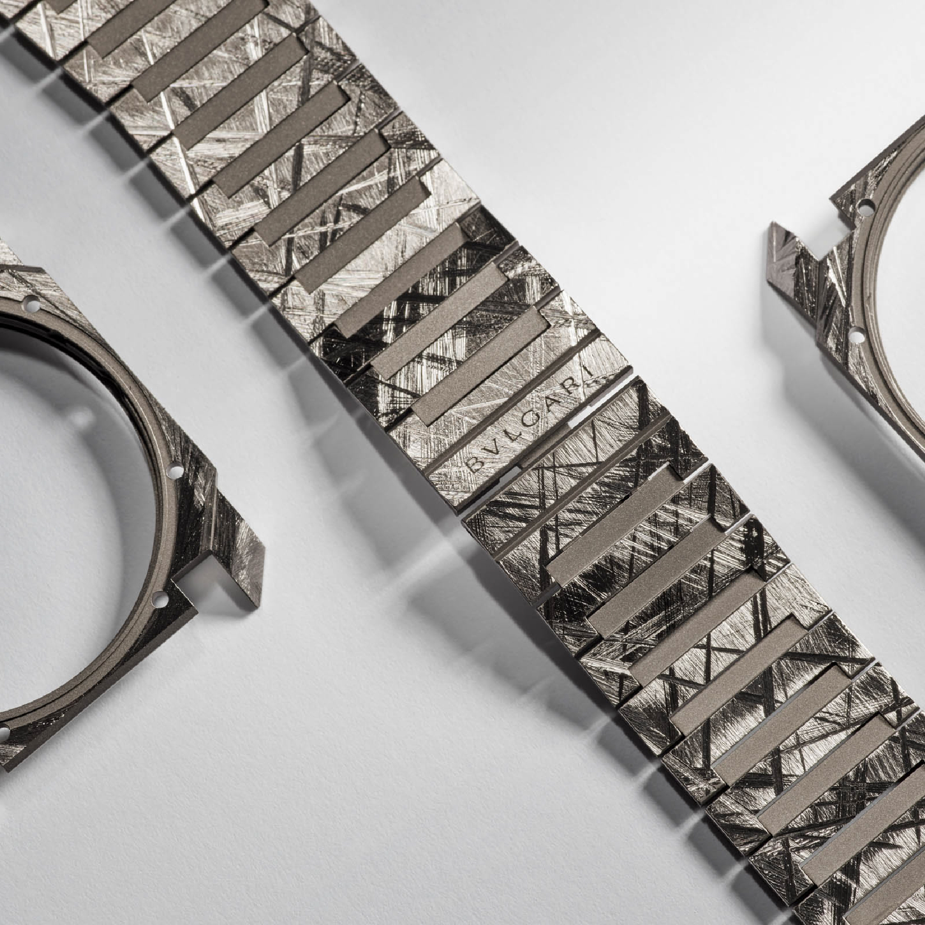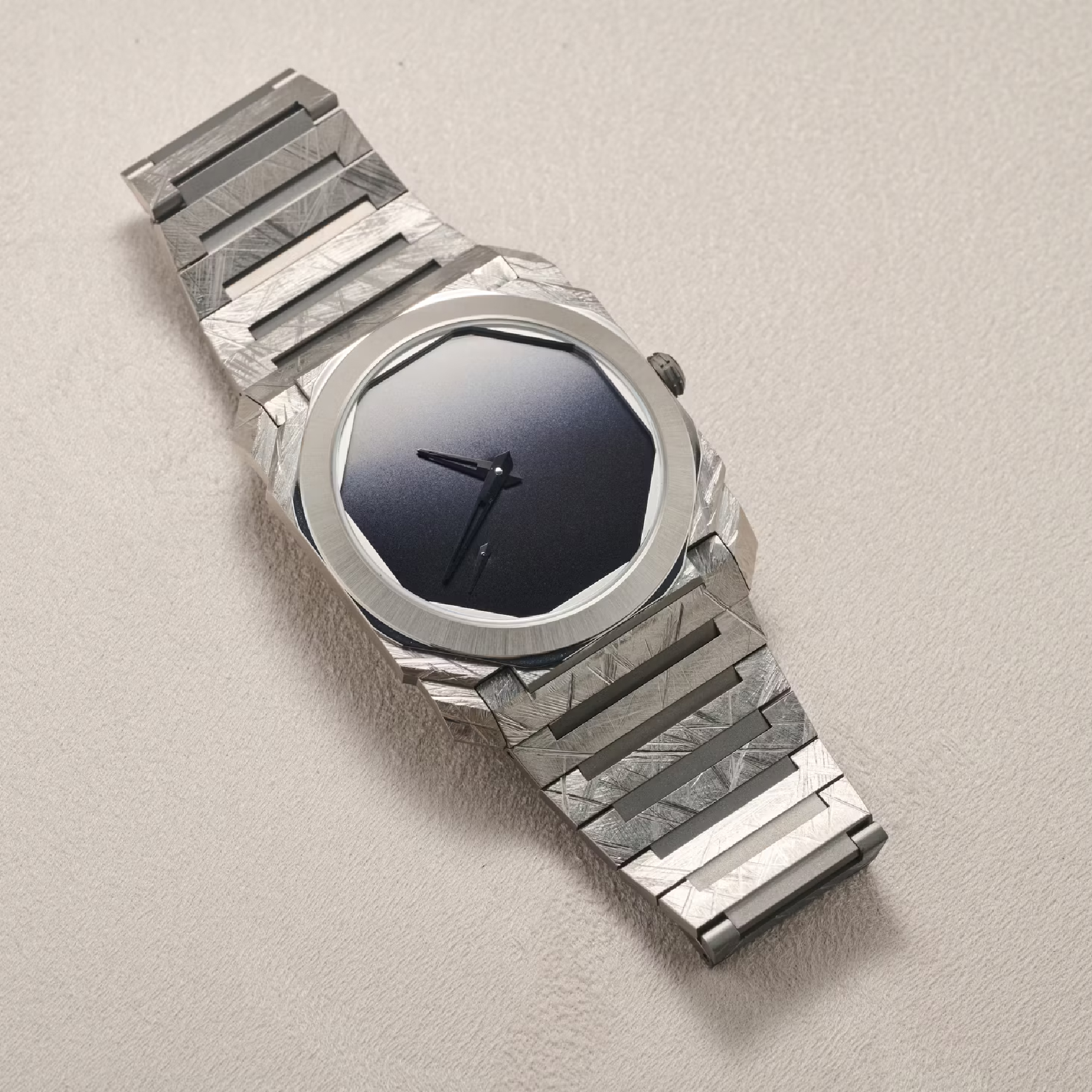 Measuring 40 mm and only 5.15 mm thick, the novelty is crafted in titanium, including both the case and the bracelet. For this edition, both case and bracelet are finished by hand with irregular crisscrossing textures that recall the patterns of meteorite, elevating the sharp geometry of the timepiece’s design.