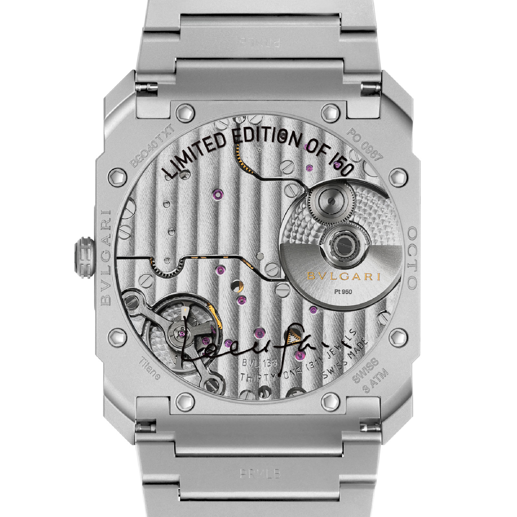 Turning the watch over, the sapphire caseback—engraved with Lee Ufan’s signature—reveals the in-house calibre BVL 138. This automatic movement features a platinum micro-rotor to maintain the slim profile. It operates at a frequency of 3 Hz and provides a 60-hour power reserve. The finishing includes thin Geneva stripes across the bridges, circular graining on the mainplate, and finely bevelled edges.
