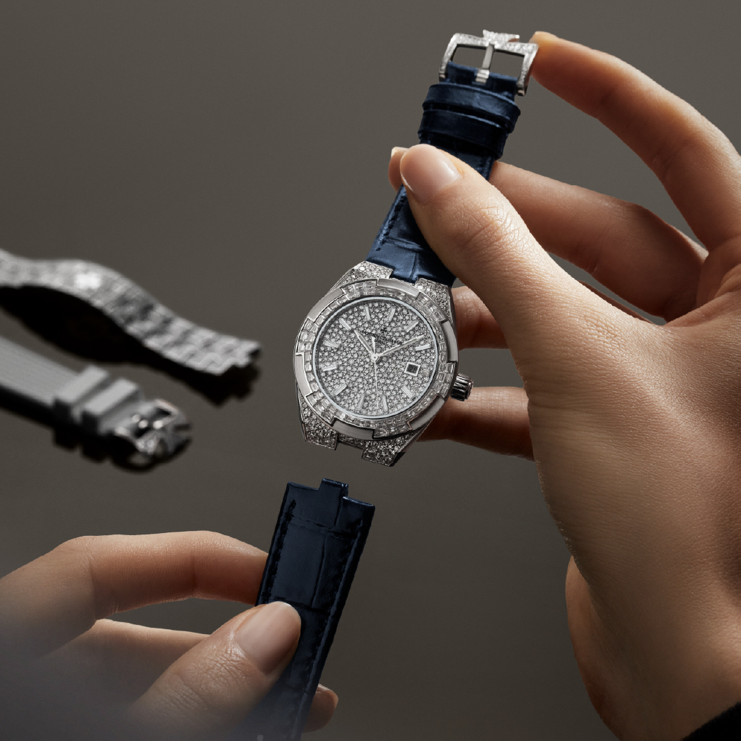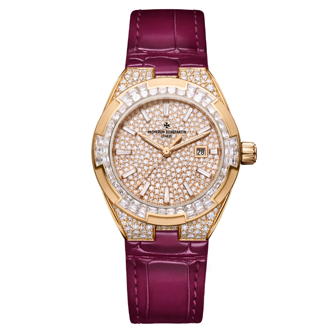 The 35 mm case was first launched in the Overseas line in 2023, designed to suit a wide range of wrists. With a thickness of 8.43 mm, the case retains the familiar Overseas design codes, including the Maltese cross–inspired bezel, integrated bracelet, and screwed-down crown. It is for the first time that, in this size, every visible surface is gem-set, totalling 1,430 diamonds weighing approximately 12.58 carats. The watches are still water-resistant to 50 metres.